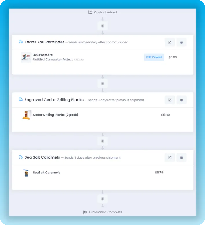 You can easily add new automated campaigns to the end of existing automations. This lets you easily create unforgettable customer experiences tailored to steps in your sales pipeline.